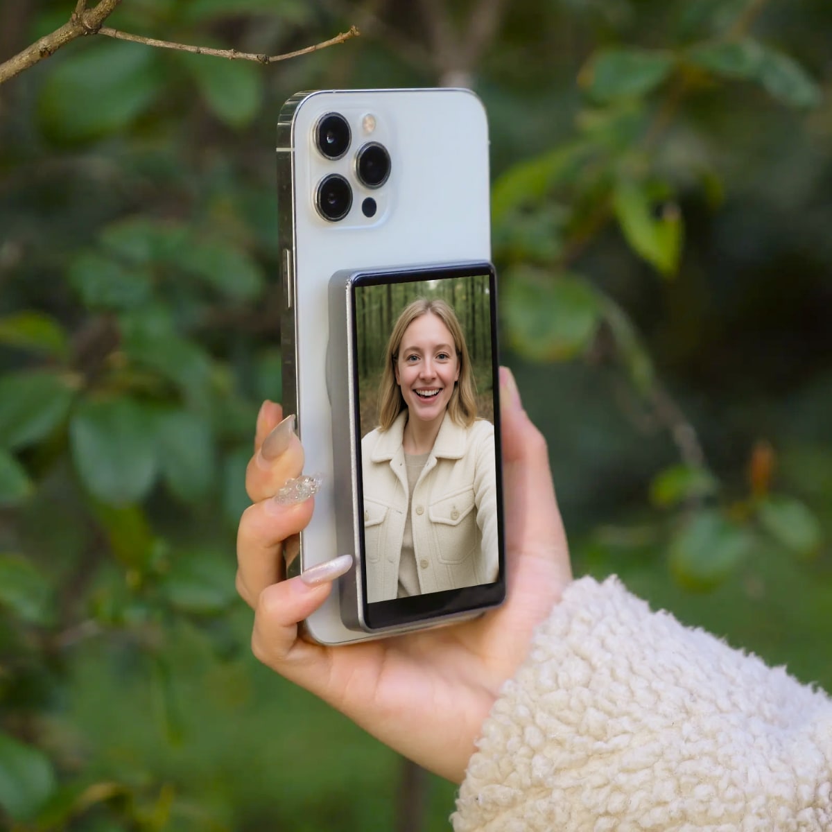 Whether you’re using an iPhone or an Android, we’ve got you covered. The Selfie Screen snaps on magnetically to any MagSafe-compatible device — and comes with a magnetic adapter ring for everything else.
